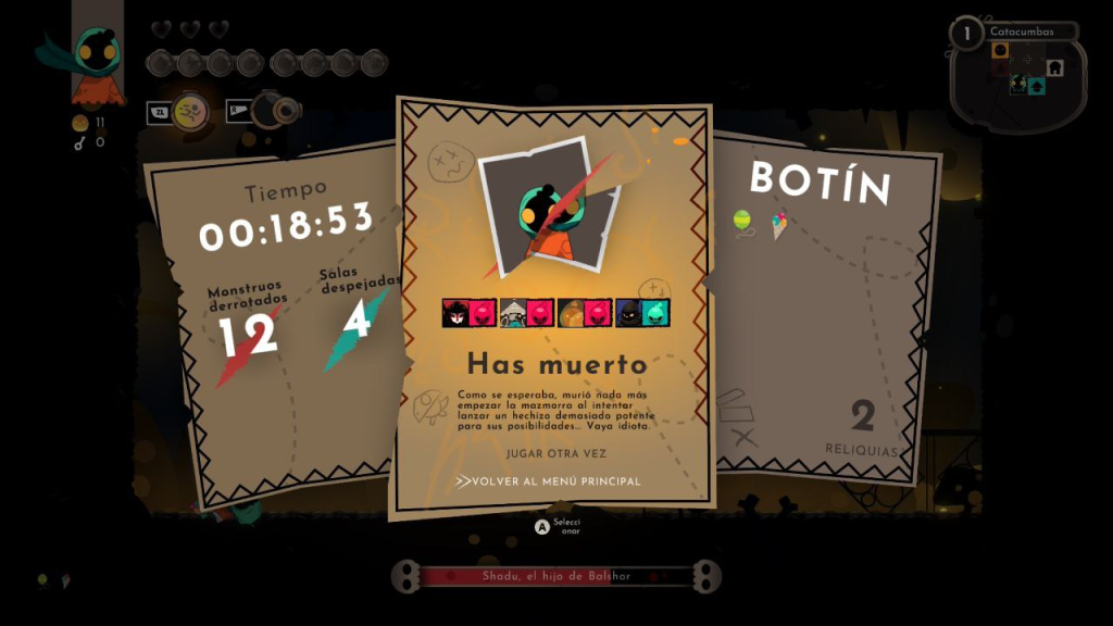 No hay que confundir Folly of the Wizards con un roguelite, en los que conservas algunas mejoras y hay progresión entre runs. Aquí no hay progresión, y somos nosotros los que tenemos que mejorar nuestra habilidad, lo cual le da cierto toque de dificultad, sobre todo al inicio. Aquí, la muerte es permanente de verdad.