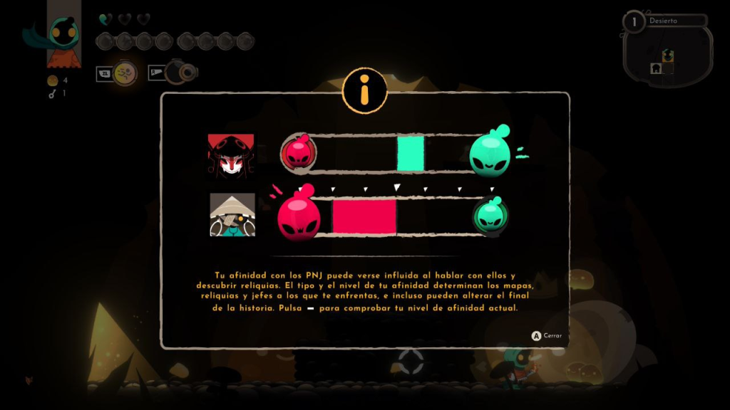 Otra mecánica del juego es la de la afinidad. Cuando nos encontramos con NPCs podremos hablar con ellos y nos darán a elegir entre dos respuestas: una que aumentará nuestra afinidad con ellos y otra que la disminuirá. Esta afinidad influirá en los objetos que encontremos, así como en la evolución de la partida. Esto sonaría muy divertido e interesante de no ser porque es una mecánica bastante desaprovechada, pues los diálogos con estos personajes son muy repetitivos y no dan mucho juego.