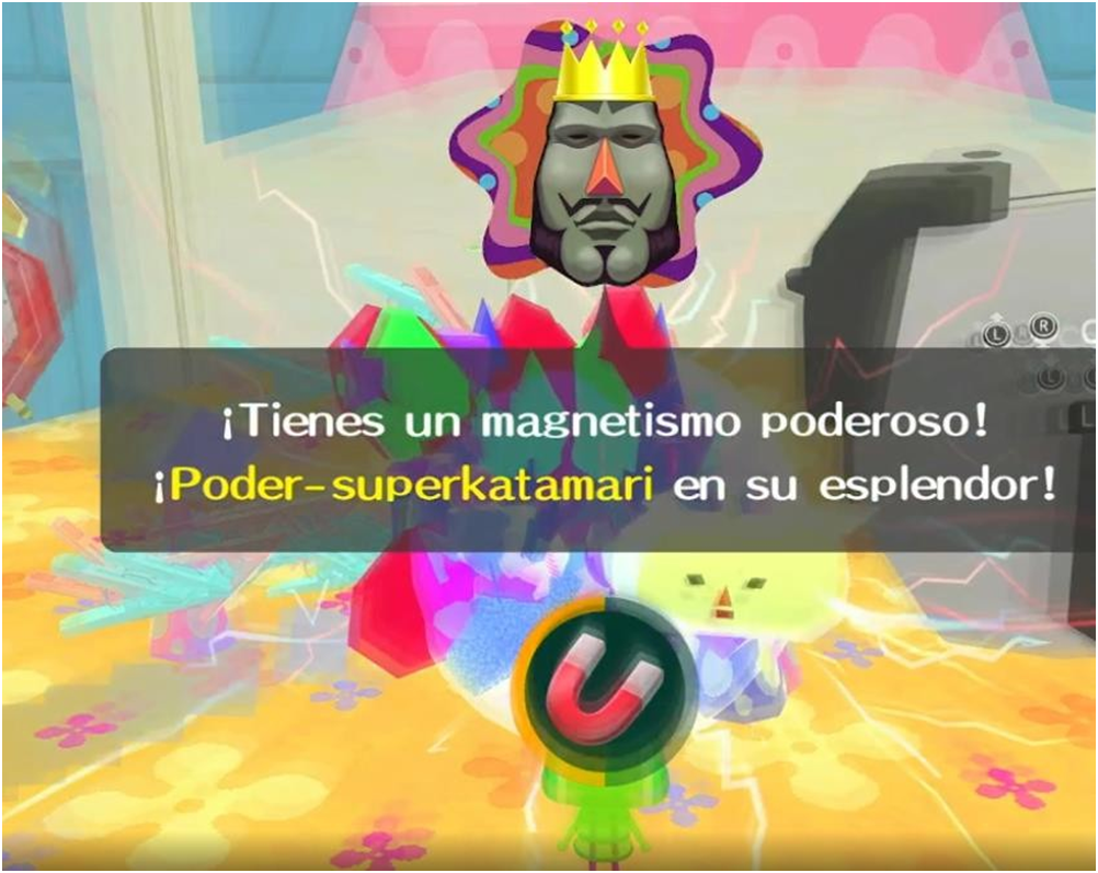 Pero… ¿qué es un katamari? «Katamari» significa «masa» al traducirlo del japonés, y en este juego también tiene exactamente esa función: contamos con una masa redonda que al rodarla vamos pegando los pequeños objetos que están en el suelo; cada vez se hace más grande y con ella también los objetos que recogemos. Podemos empezar adheriendo una mosca y acabar con un edificio entero. Rodamos y rodamos con el objetivo de complacer al Rey del Cosmos, una especie de deidad con un gran sentido del humor y un poco arrogante, que estaba un poco aburrido una tarde y acabó con parte del universo por equivocación (lo típico, vaya). Ahora somos nosotros los encargados de