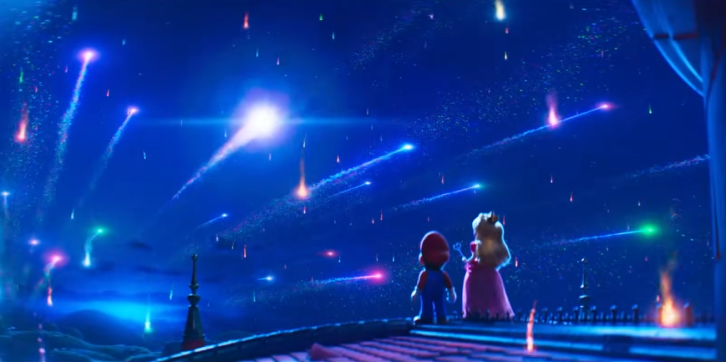 Peach y Mario contemplan una lluvia de estrellas desde el castillo de la princesa. No sabemos si esto es algo bueno o malo, aunque, si tuviera que teorizar, creo que será la razón por la que deban viajar a otras galaxias.