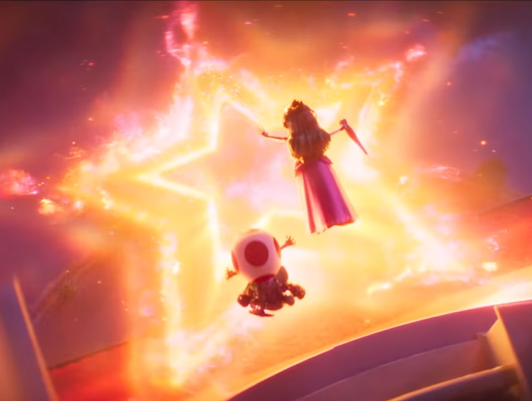 Después, aparece de nuevo nuestro querido Toad, al cual adoré en la primera película, junto a Peach. Ambos saltan hacia una estrella gigante, que es igual a las que nos impulsan hacia los diferentes planetas en el videojuego de Super Mario Galaxy.