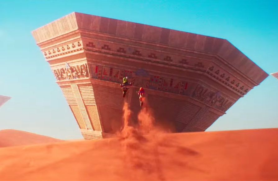 Mario y Luigi atraviesan un desierto montados en moto. Todo era normal hasta que nos muestran la pirámide invertida del Reino de las Arenas de Super Mario Odyssey.